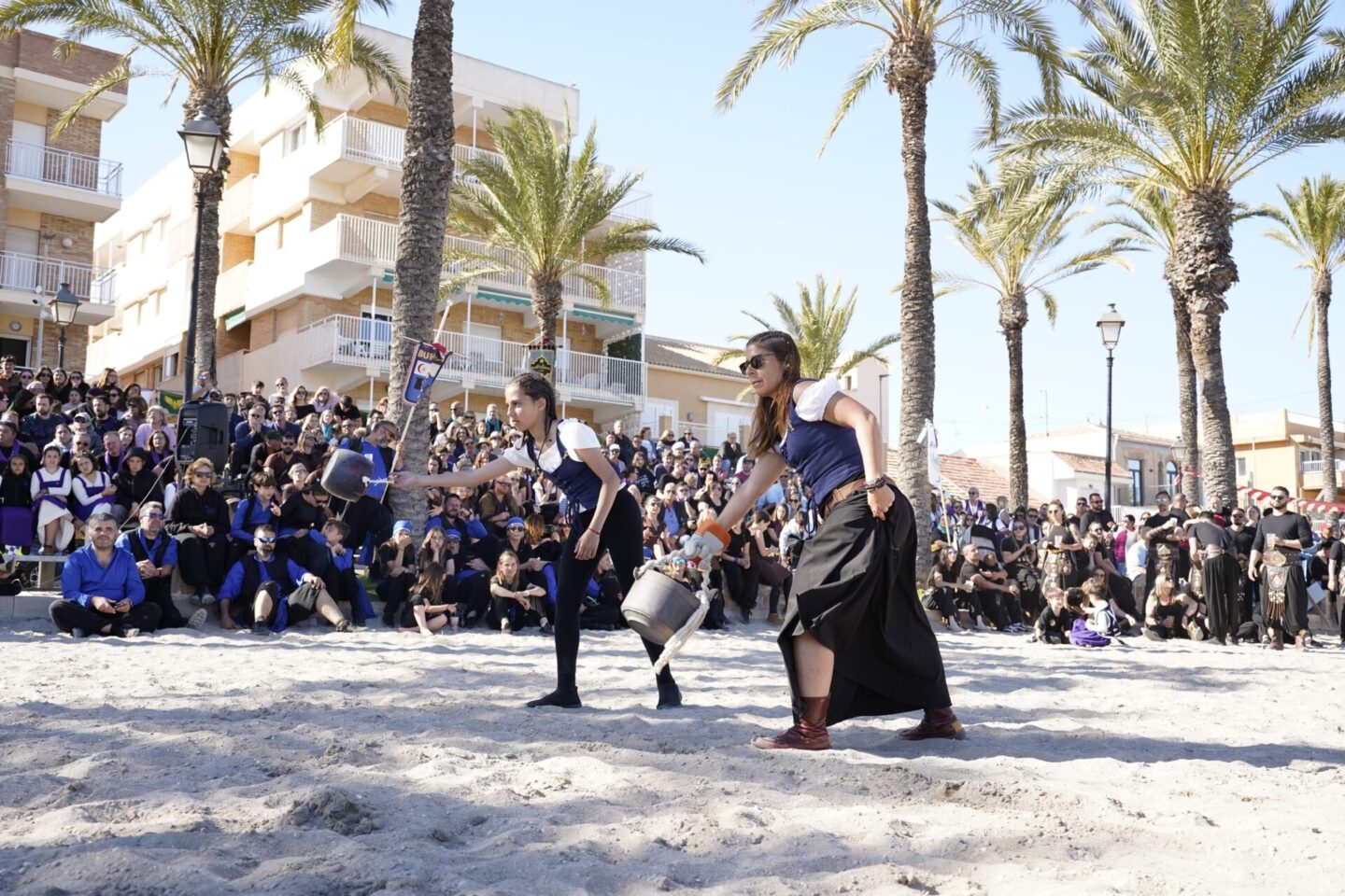Vecinos, visitantes y turistas acudían estos días a las diferentes recreaciones históricas y eventos de la programación, llenando calles y gradas en cada una de estas citas. Así fue en el desfile de antorchas y el Encendido de la Llama, que marcó el inicio oficial del 25 aniversario, donde la consejera de Turismo, Cultura, Juventud y Deportes, Carmen Conesa, entregó en la Playa de la Concha el certificado de Interés Turístico Regional al alcalde de Los Alcázares, Mario Pérez Cervera, entre los aplausos de una localidad que impulsa con esta distinción su historia y tradición en todo el mapa regional. Desde ese momento, cristianos y berberiscos luchaban por la hegemonía del Mar Menor. Así se vio en el Desembarco Berberisco, uno de los eventos de mayor expectación, que generó largas colas para conseguir un sitio en las gradas, cuyo aforo se completó al poco de abrir el acceso. La gran pantalla que se instaló en el lugar permitió que cientos de personas pudieran seguir en directo este acto, cargado de acción entre explosiones, fuego, batallas de justas y luchas a espadas entre los dos bandos.