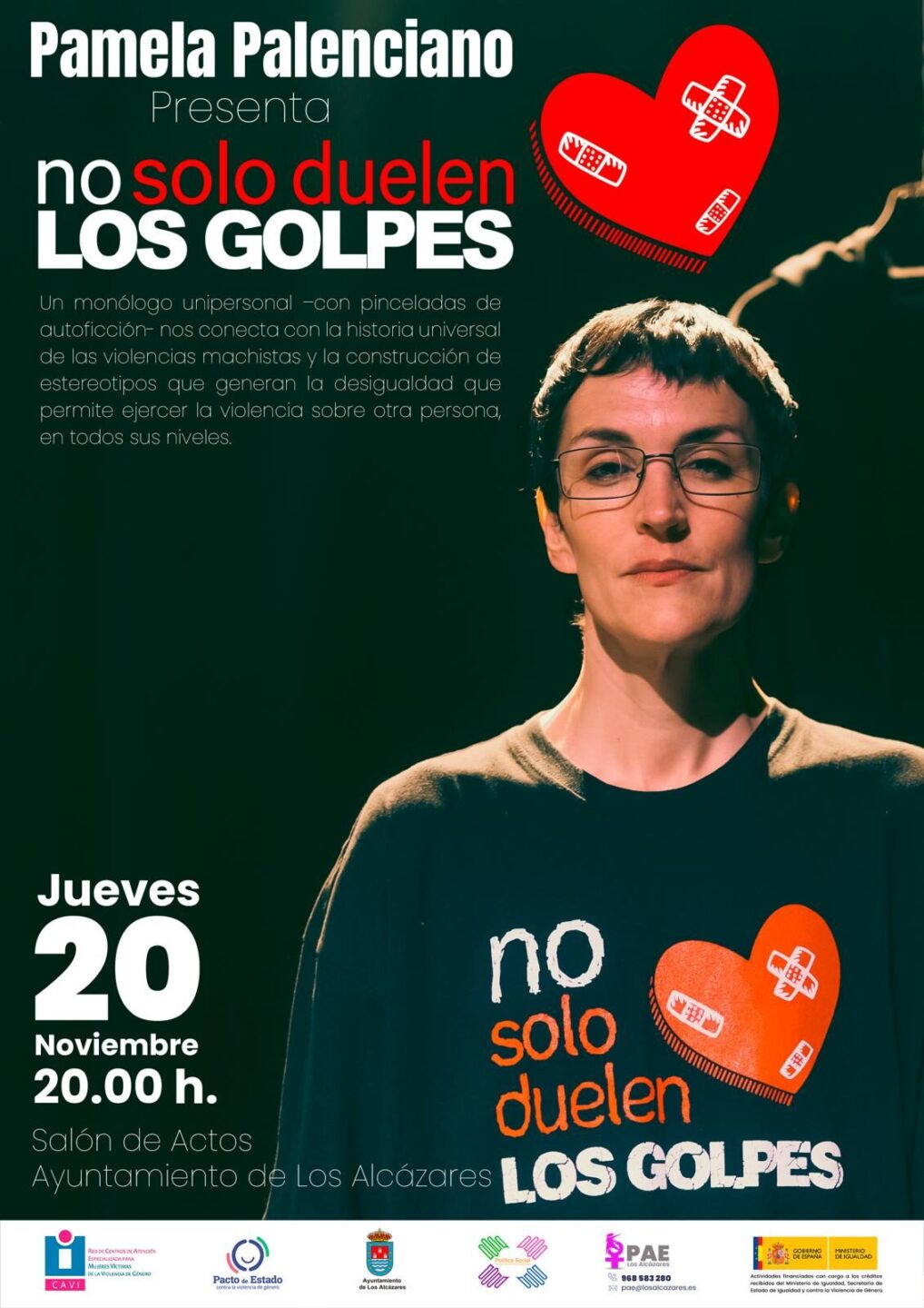 El jueves 20 de noviembre, el Salón de Plenos acogerá el monólogo teatral ‘No solo duelen los golpes’, de Pamela Palenciano, una obra reconocida por su impacto social y su mensaje directo contra la violencia machista.