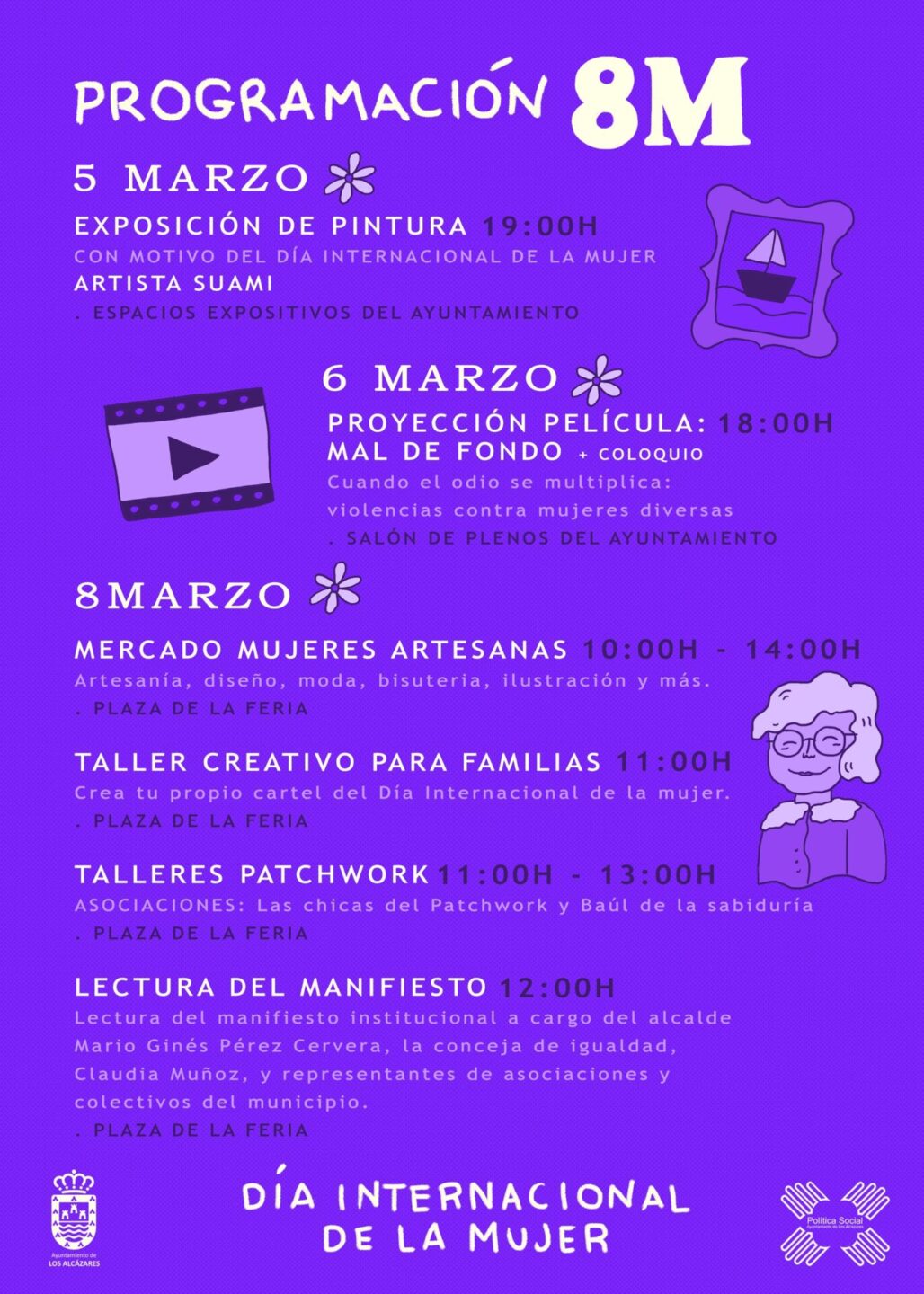 El 8 de marzo se realizará la lectura del manifiesto por diferentes representantes del Gobierno local, asociaciones y vecinos, a las 12:00 horas en la Plaza de la Feria. En esa misma ubicación, a partir de las 10:00 horas, se podrá visitar el mercado con creaciones de mujeres artesanas y se realizarán talleres para realizar carteles por el Día Internacional de la Mujer y para aprender patchwork y crear telas creativas y originales.